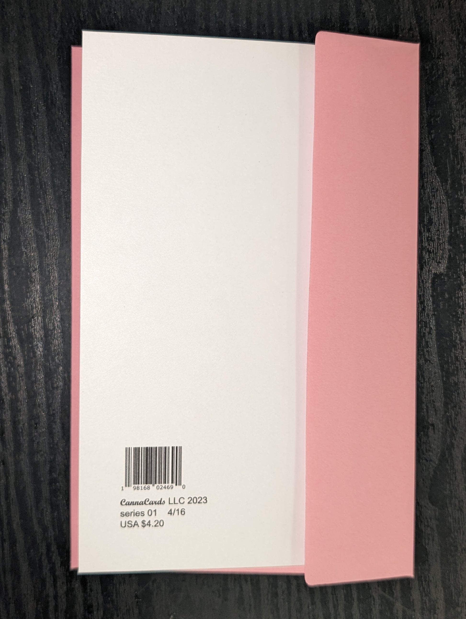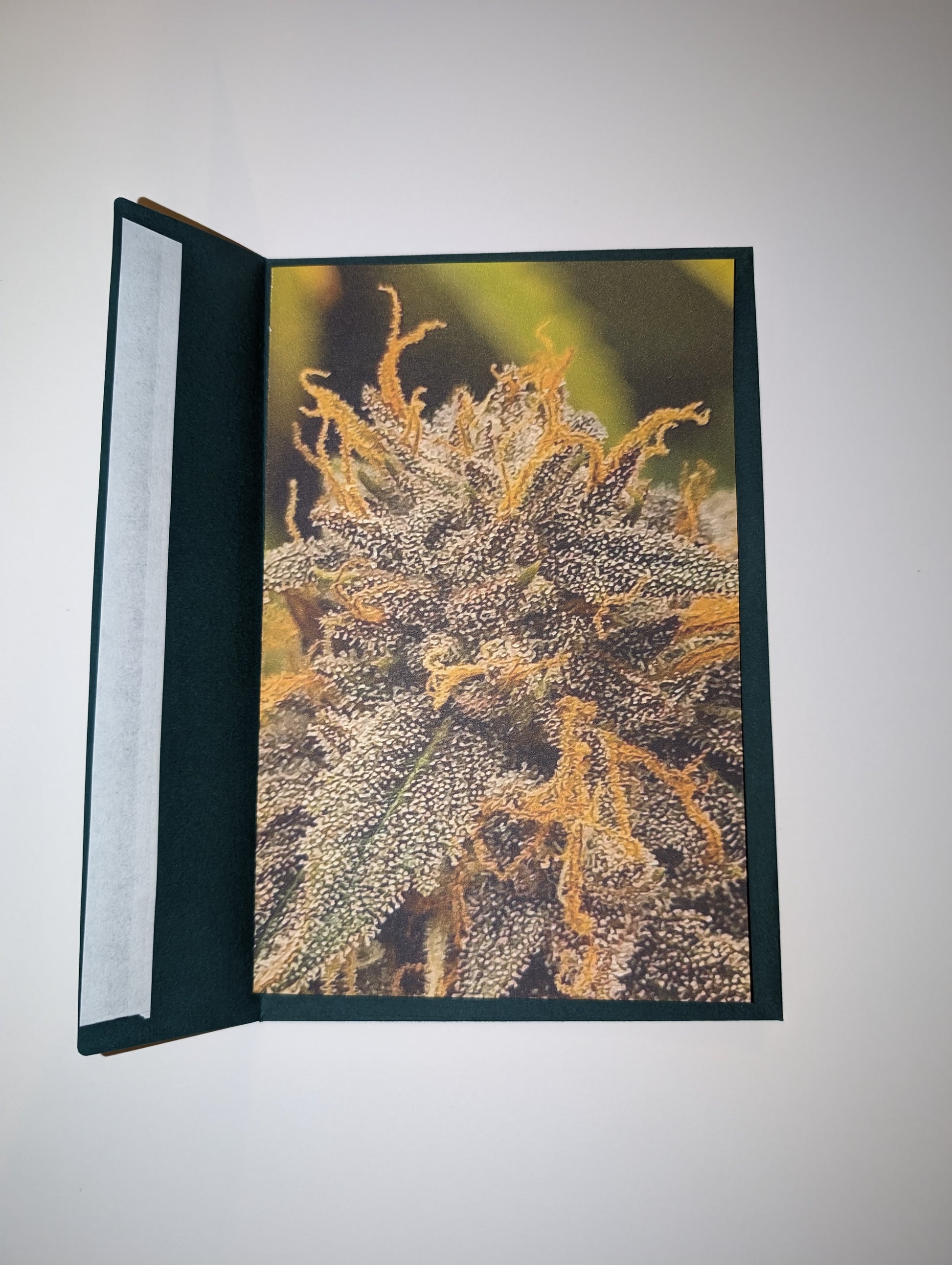 Measuring at 8 and 1/2" x 6 and 1/2", this greeting card boasts a beautiful photograph of a cannabis plant. Each card includes a random colored envelope, adding a touch of mystery to every purchase.