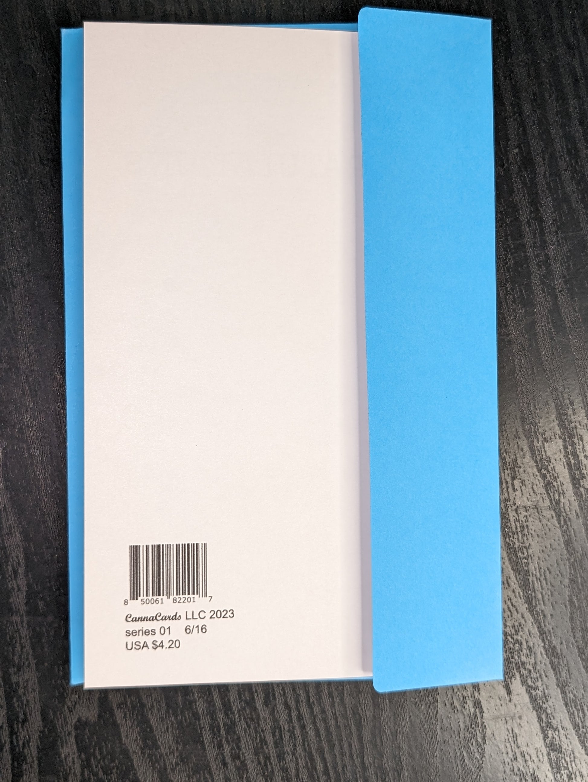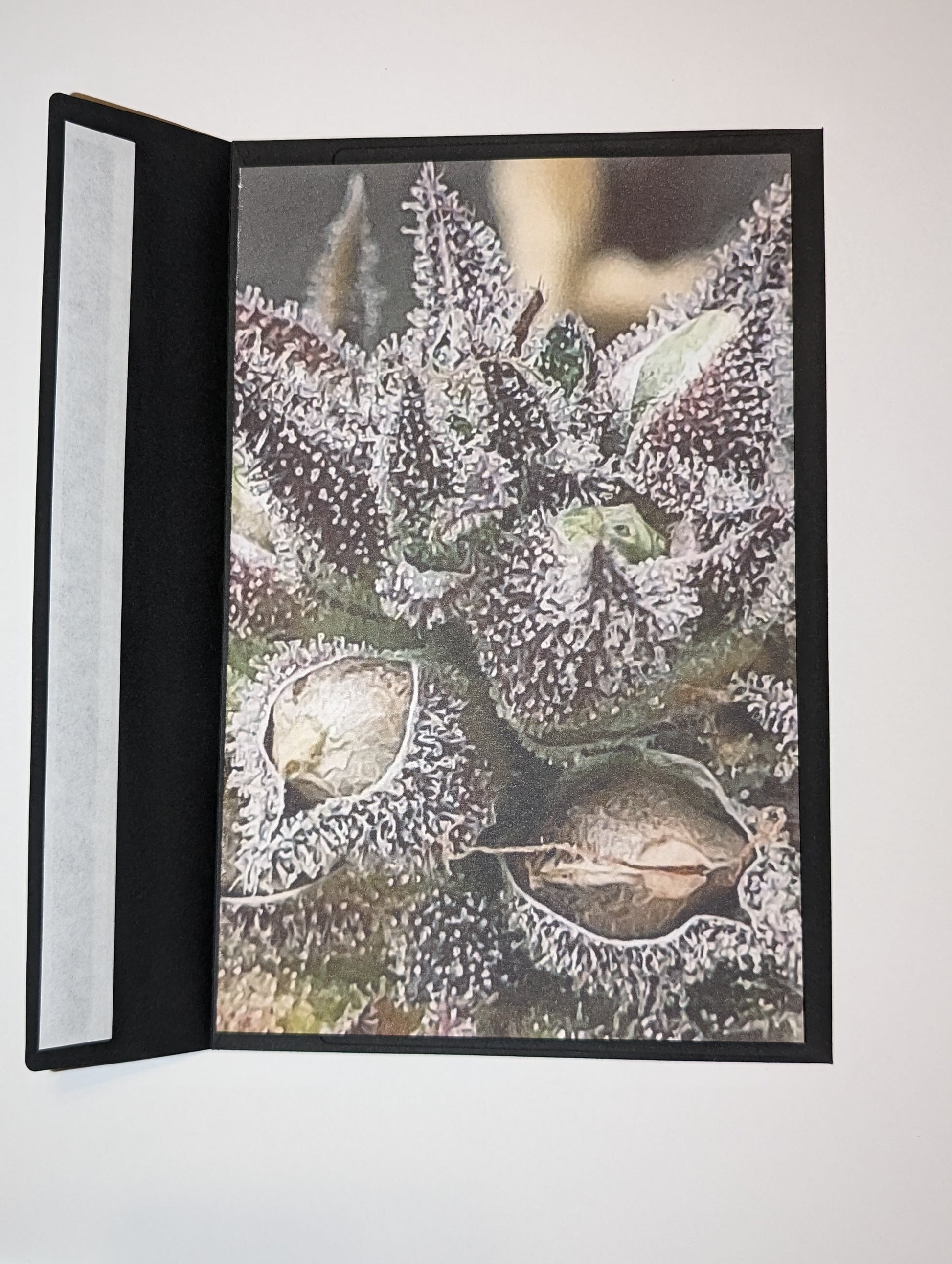 Measuring at 8 and 1/2" x 6 and 1/2", this greeting card boasts a beautiful photograph of a cannabis plant. Each card includes a random colored envelope, adding a touch of mystery to every purchase.