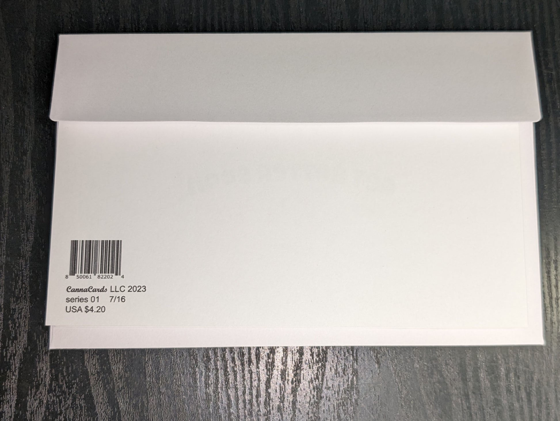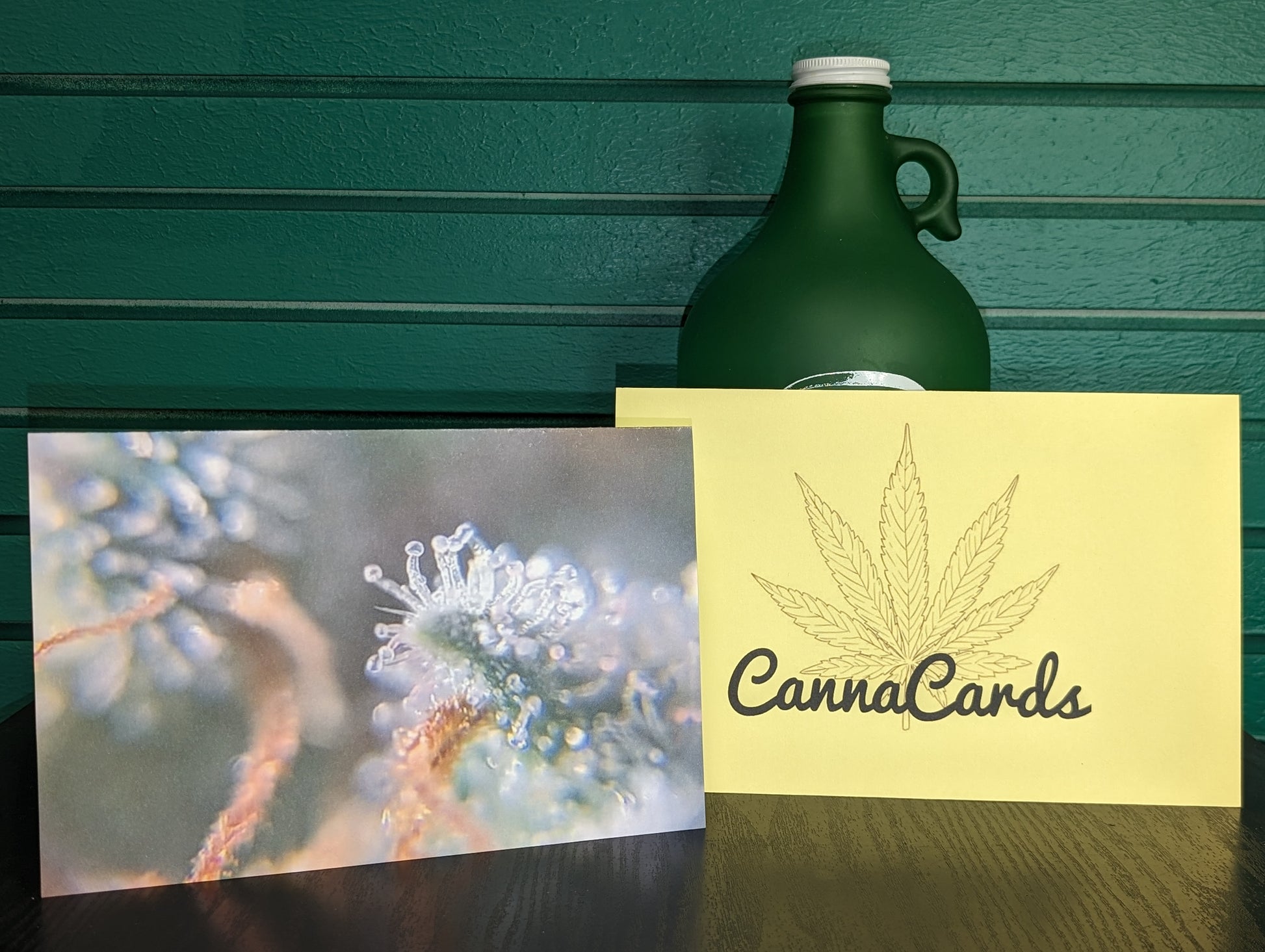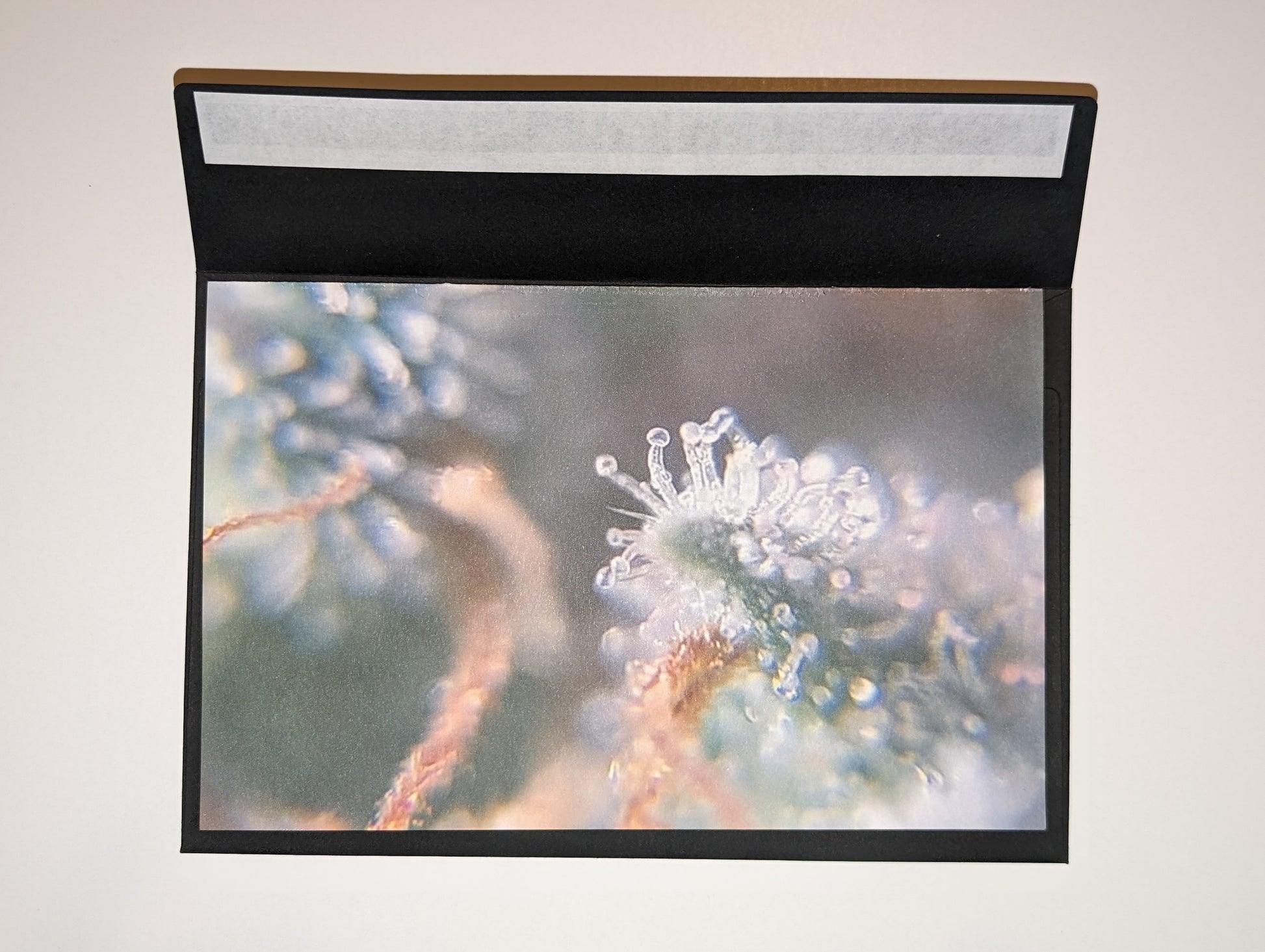 Measuring at 8 and 1/2" x 6 and 1/2", this greeting card boasts a beautiful photograph of a cannabis plant. Each card includes a random colored envelope, adding a touch of mystery to every purchase.