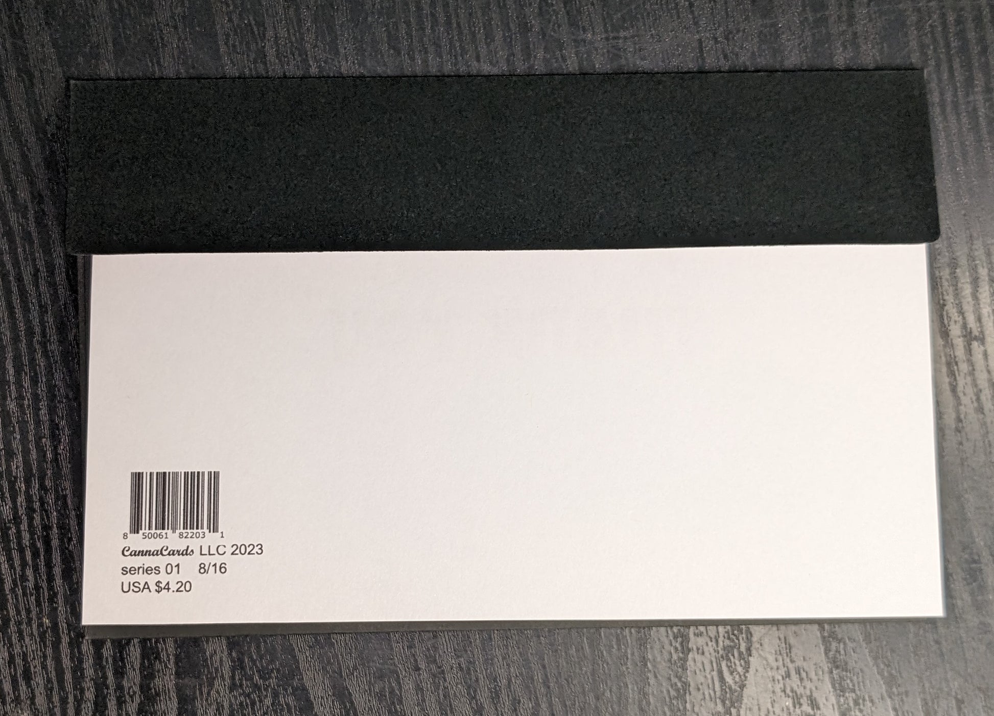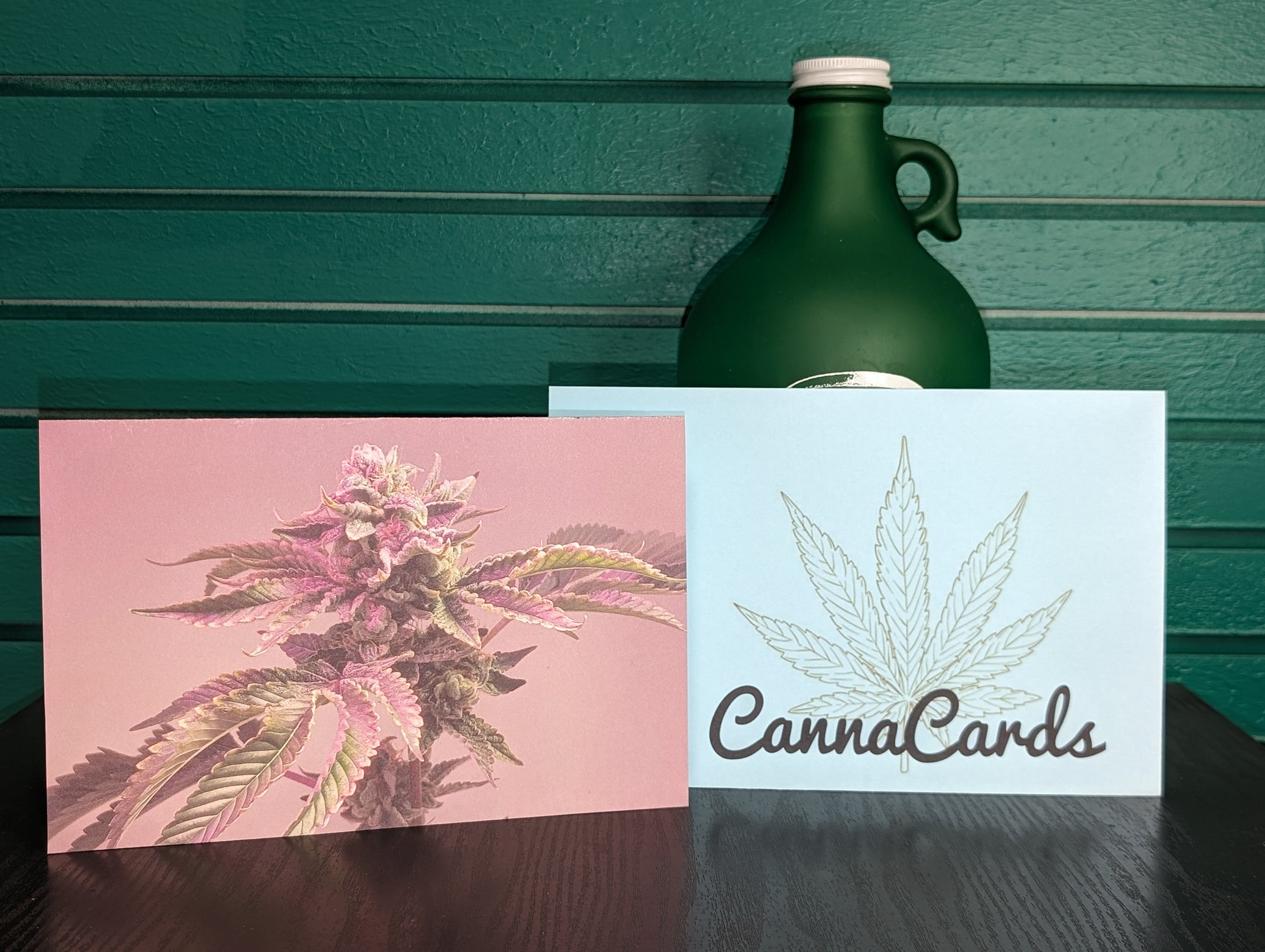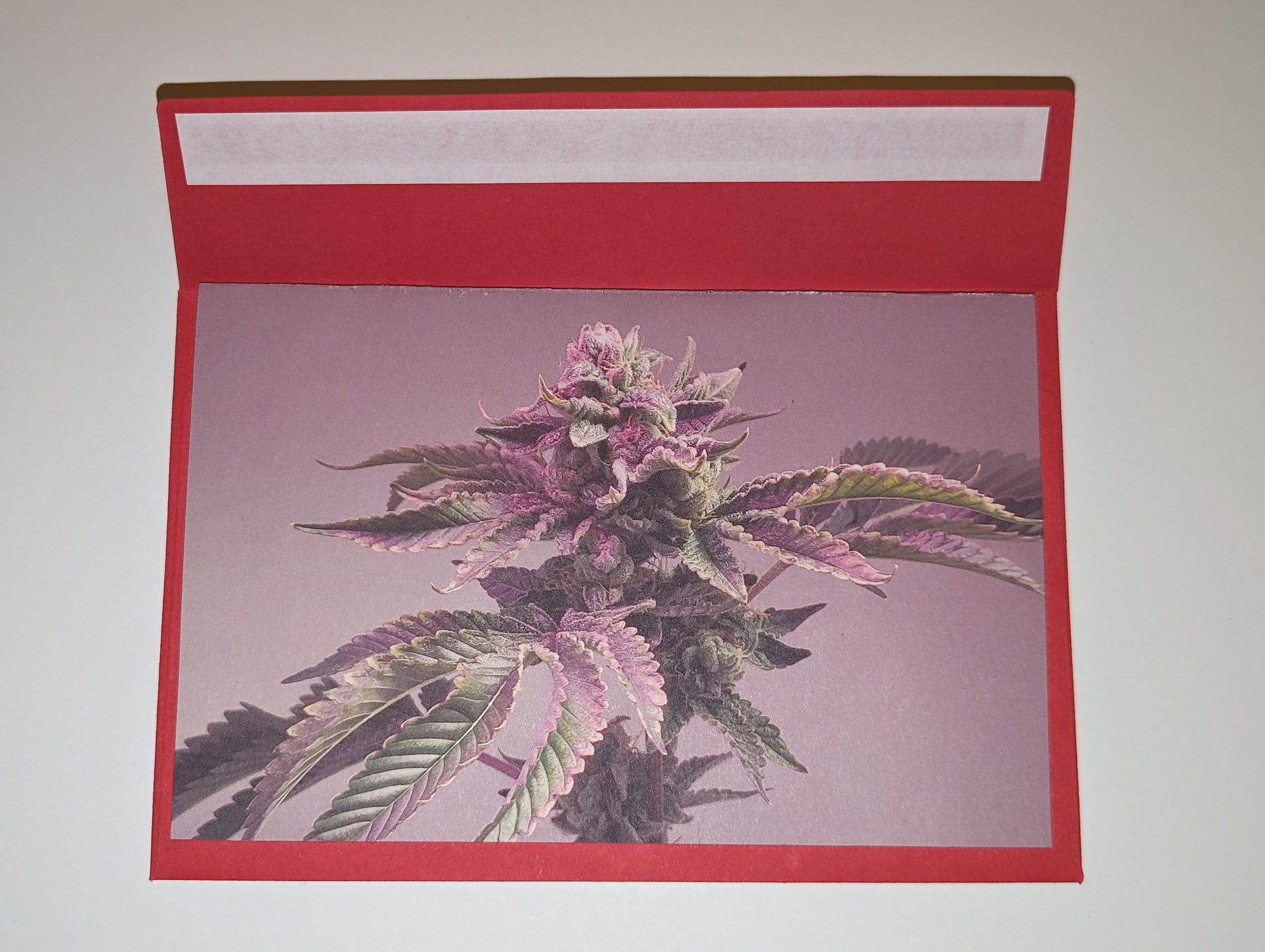 Measuring at 8 and 1/2" x 6 and 1/2", this greeting card boasts a beautiful photograph of a cannabis plant. Each card includes a random colored envelope, adding a touch of mystery to every purchase.