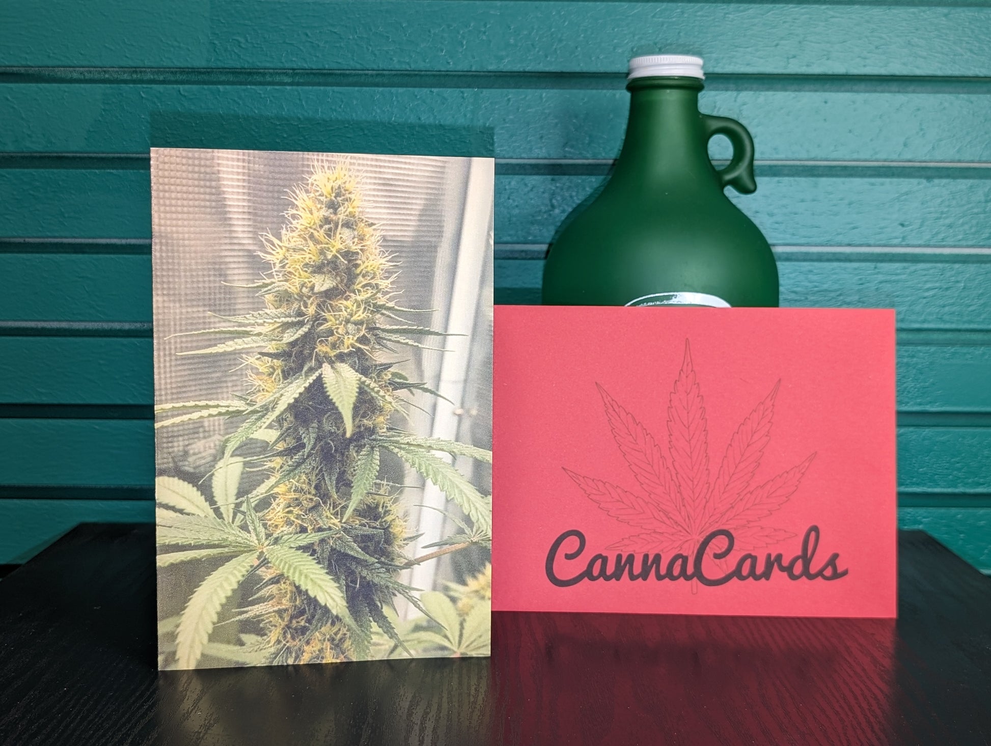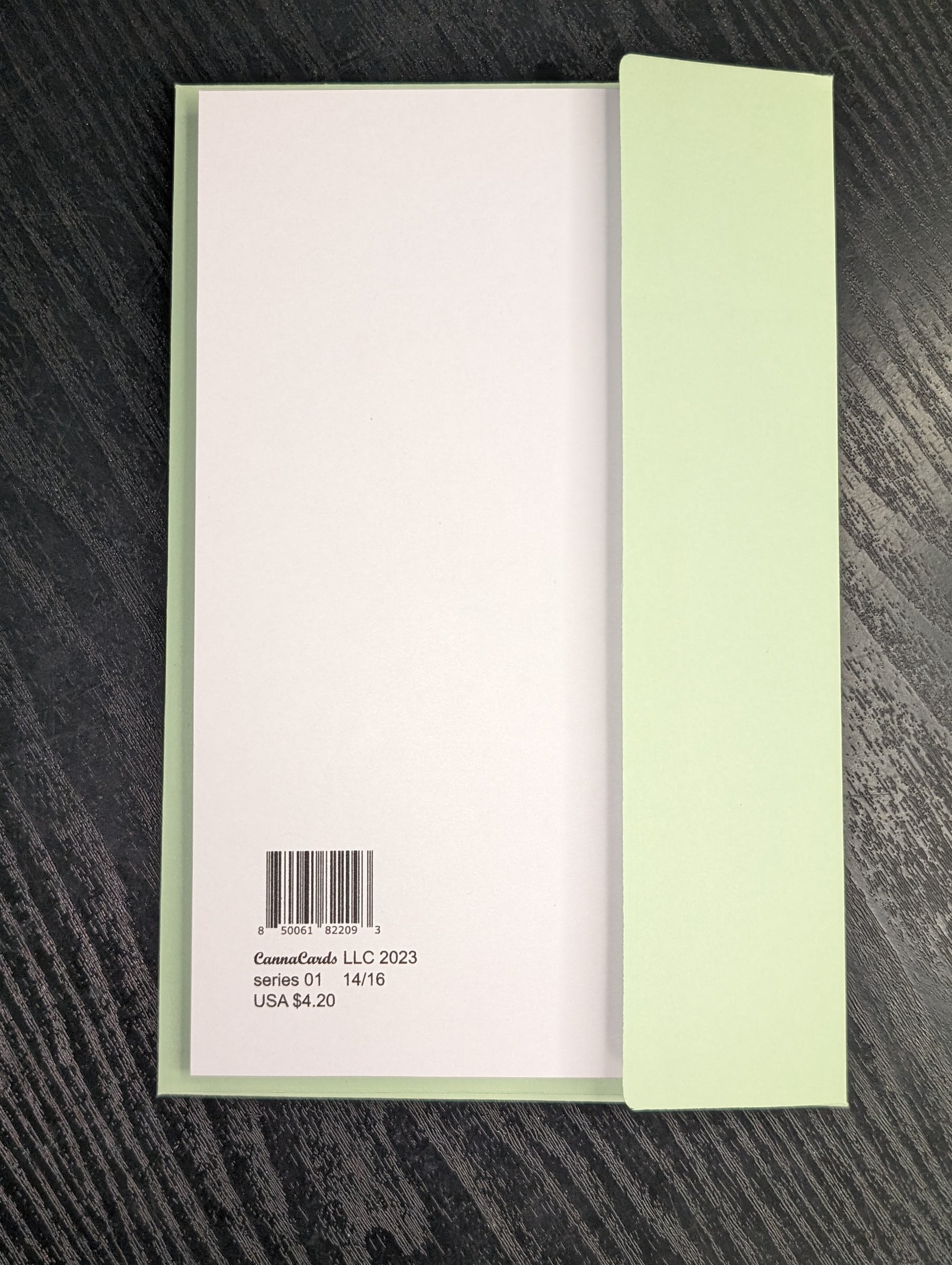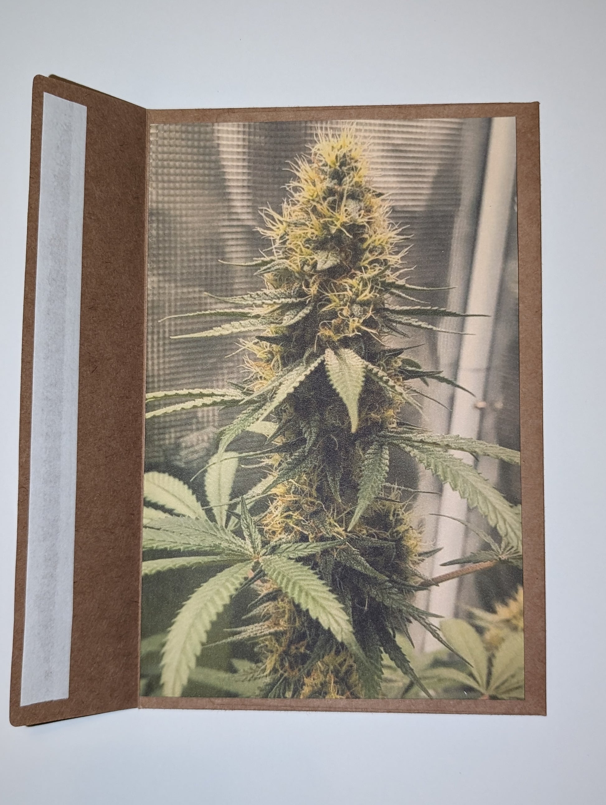 Measuring at 8 and 1/2" x 6 and 1/2", this greeting card boasts a beautiful photograph of a cannabis plant. Each card includes a random colored envelope, adding a touch of mystery to every purchase.
