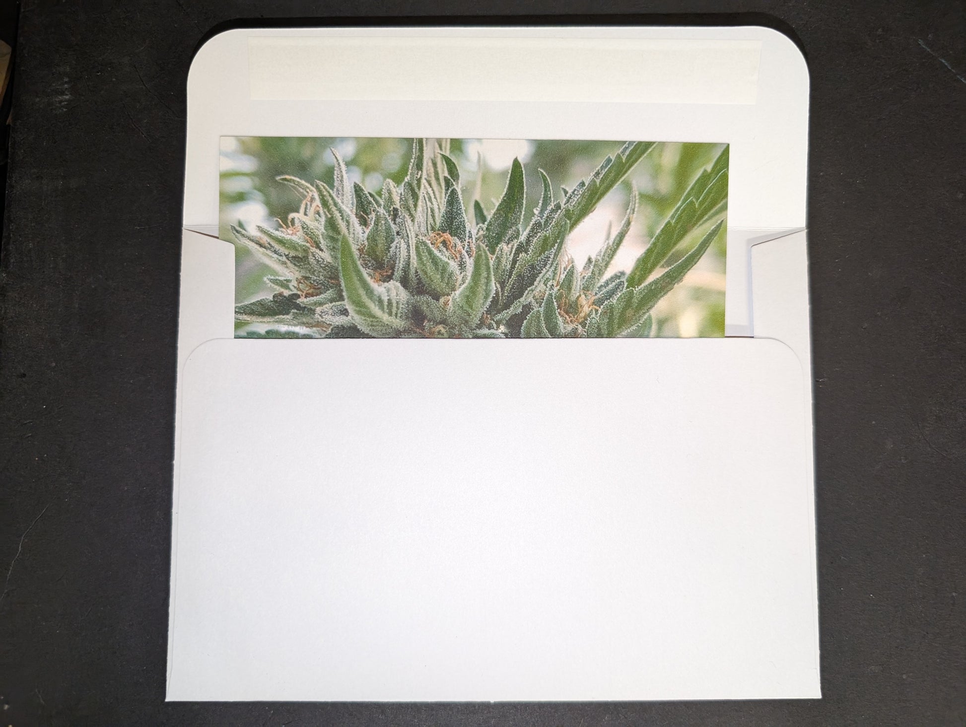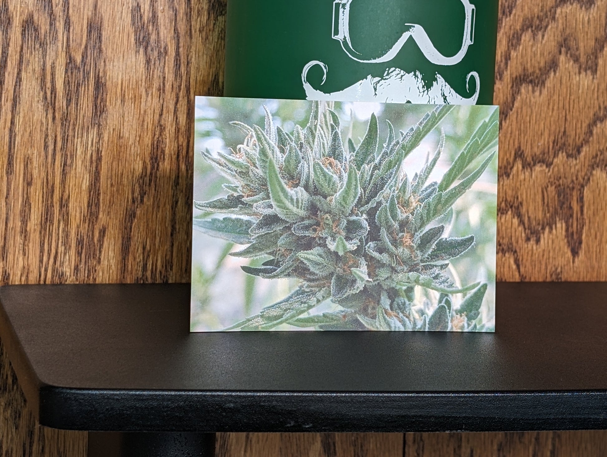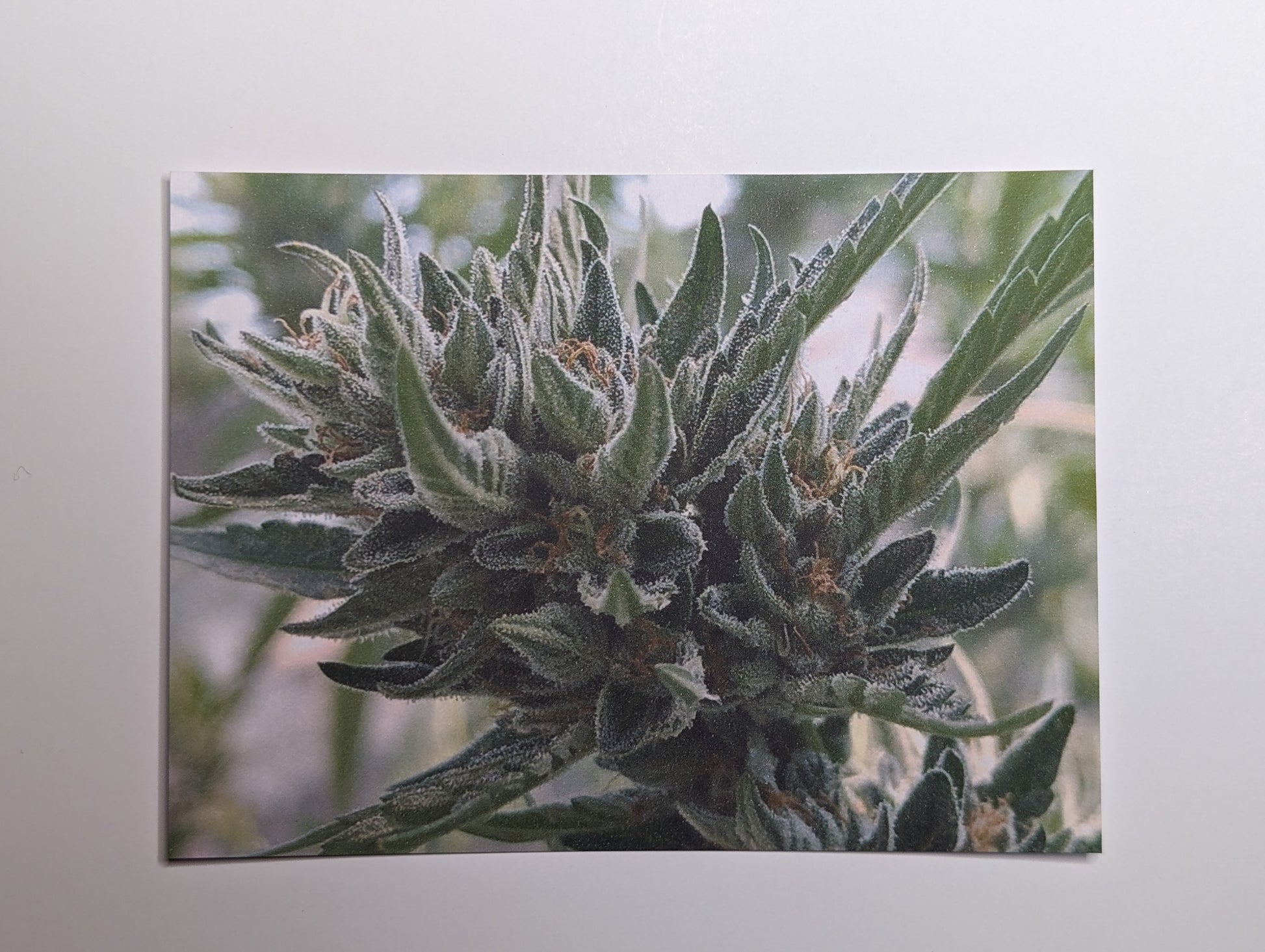 Measuring at 3 and 3/4" x 5 and 1/4", this postcard features a stunning photograph of a cannabis plant. It is an ideal present for elevated individuals and each card provides strain-specific details about its lineage, potential flavor, aroma, and effects on the reverse.