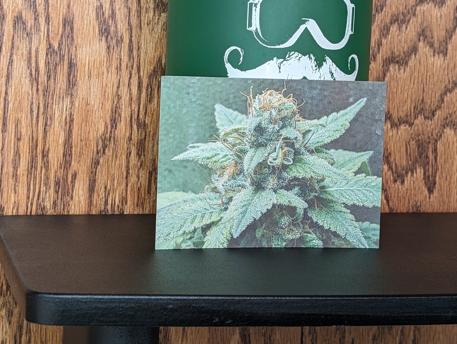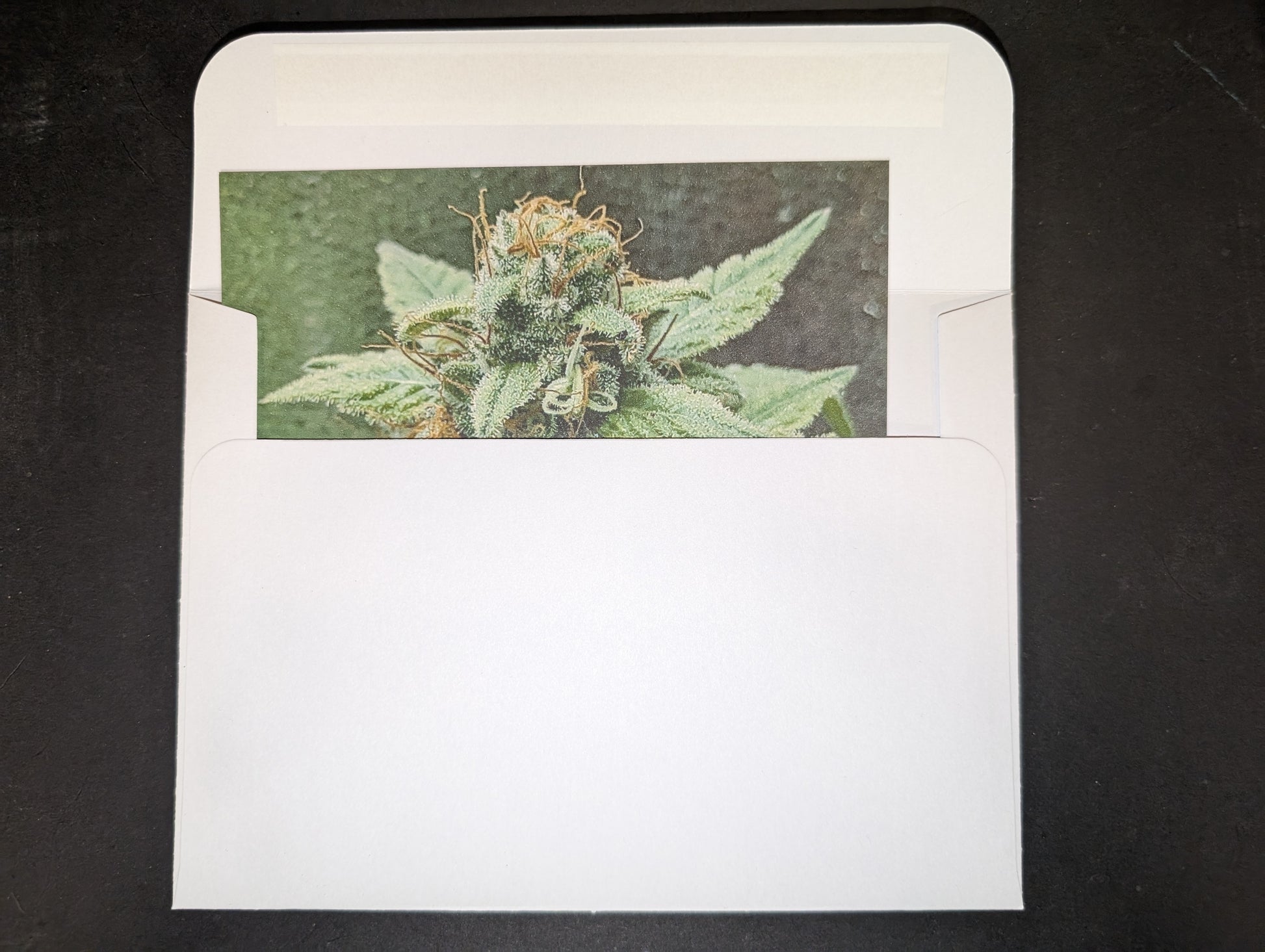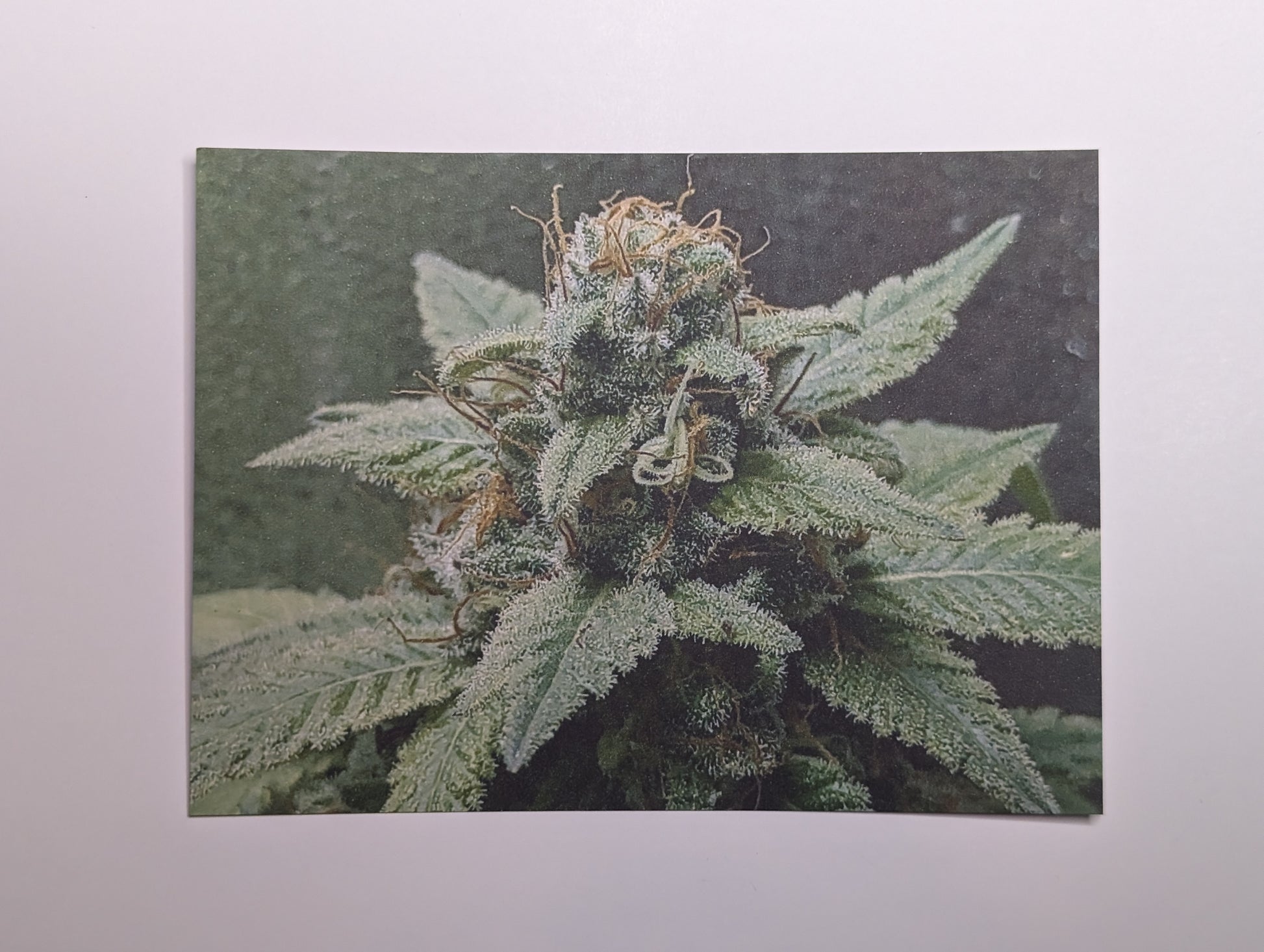 Measuring at 3 and 3/4" x 5 and 1/4", this postcard features a stunning photograph of a cannabis plant. It is an ideal present for elevated individuals and each card provides strain-specific details about its lineage, potential flavor, aroma, and effects on the reverse.
