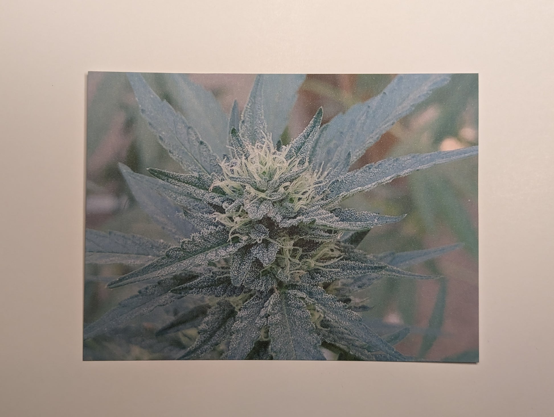 Measuring at 3 and 3/4" x 5 and 1/4", this postcard features a stunning photograph of a cannabis plant. It is an ideal present for elevated individuals and each card provides strain-specific details about its lineage, potential flavor, aroma, and effects on the reverse.
