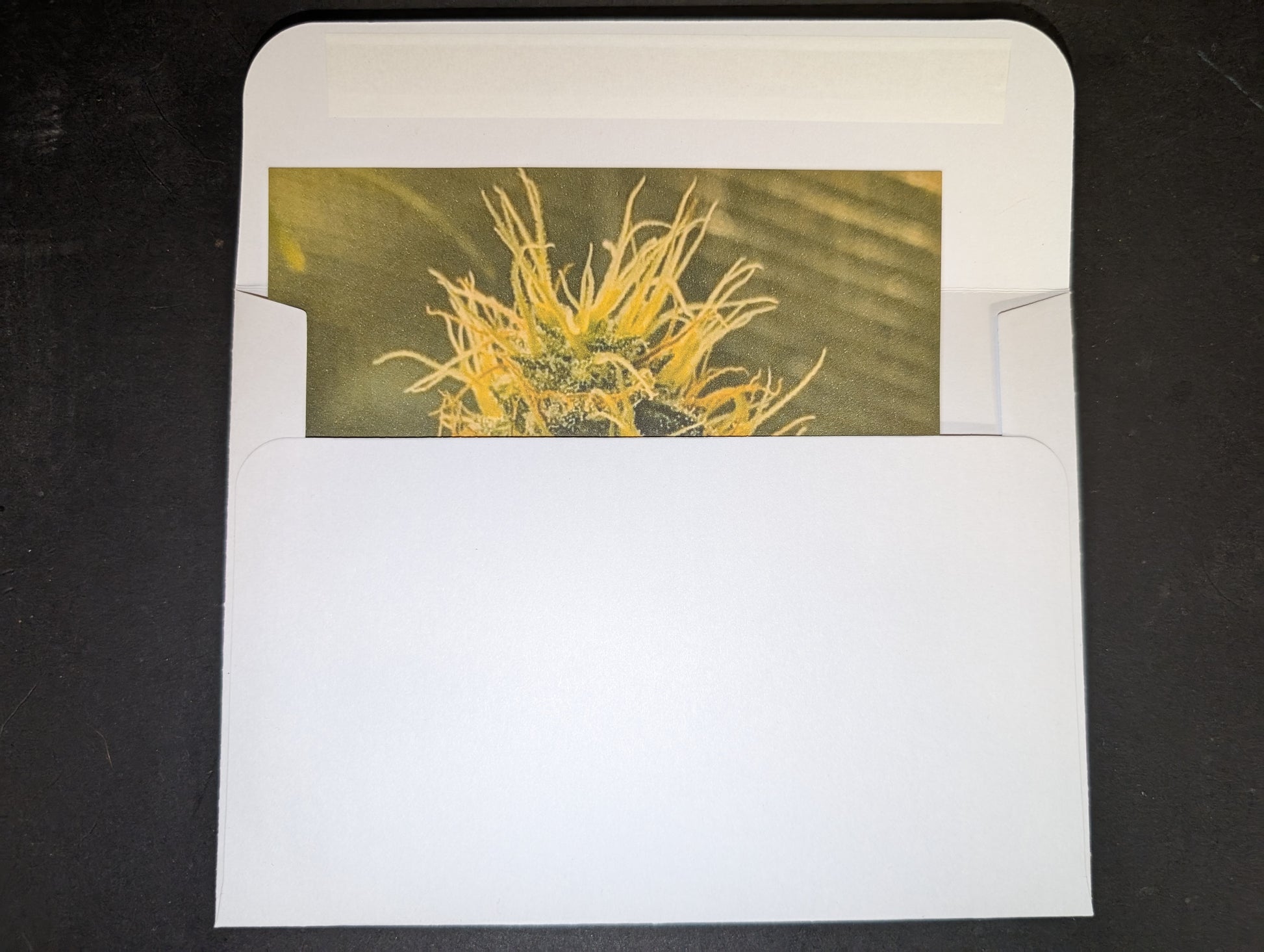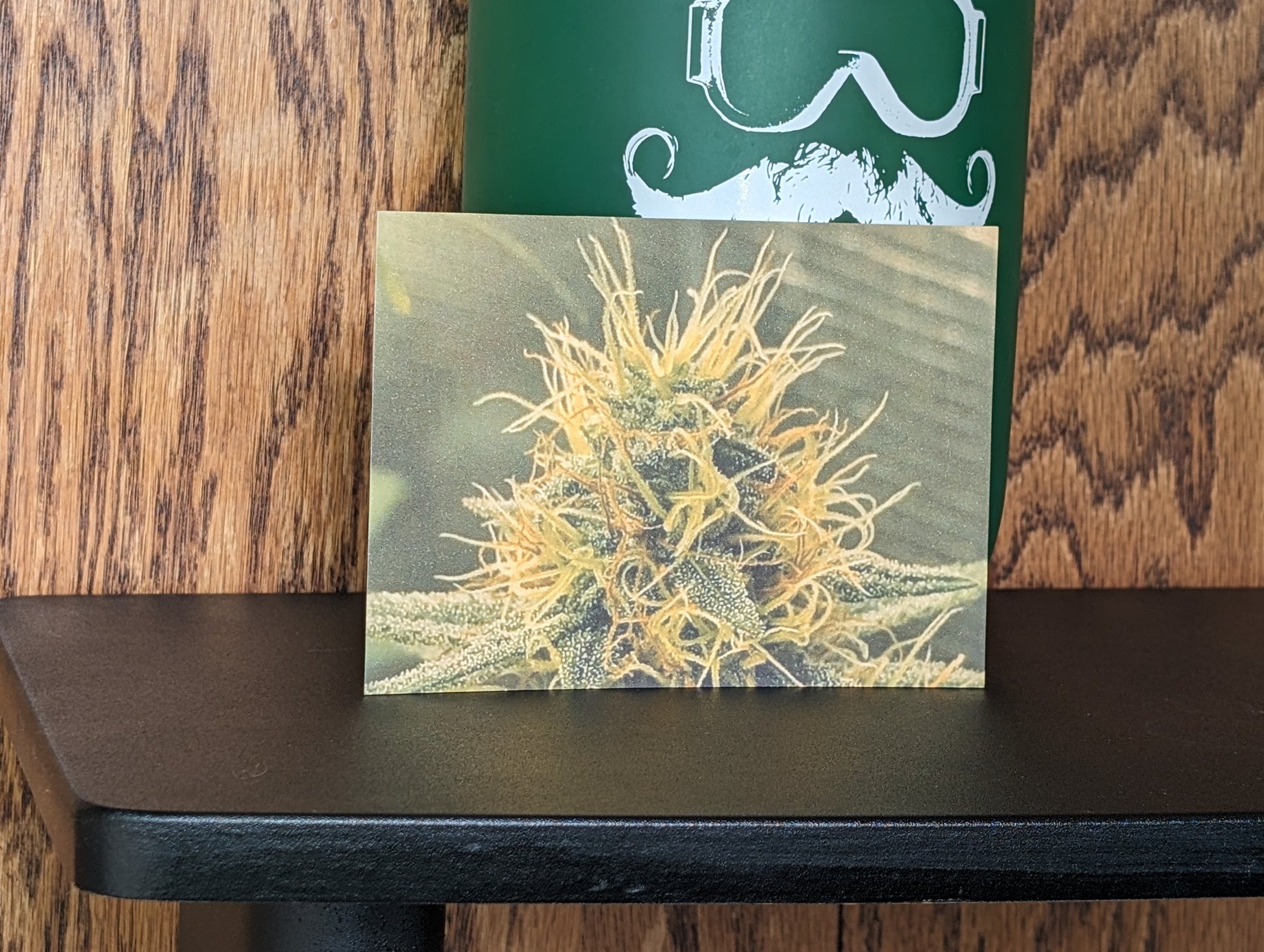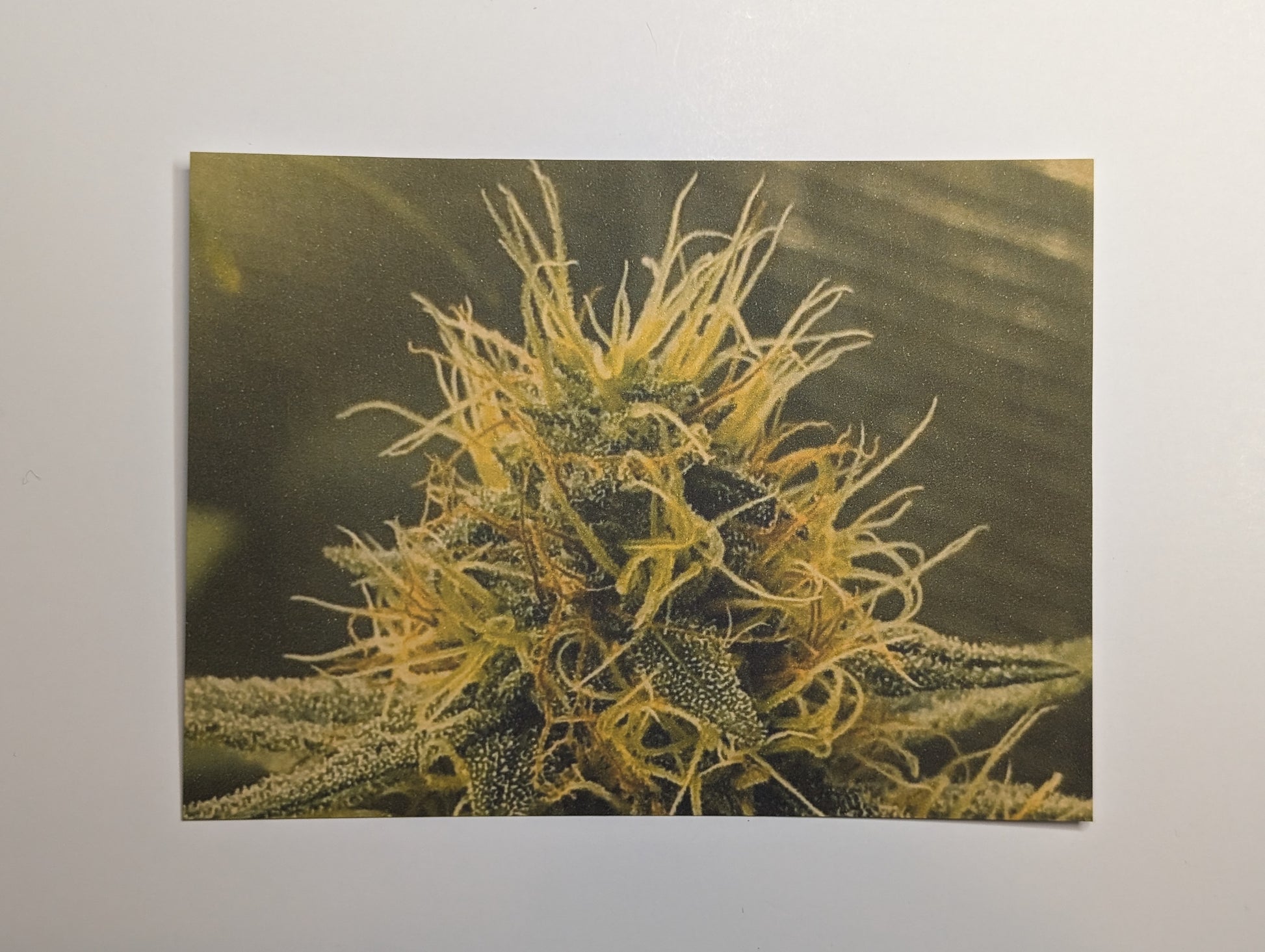 Measuring at 3 and 3/4" x 5 and 1/4", this postcard features a stunning photograph of a cannabis plant. It is an ideal present for elevated individuals and each card provides strain-specific details about its lineage, potential flavor, aroma, and effects on the reverse.